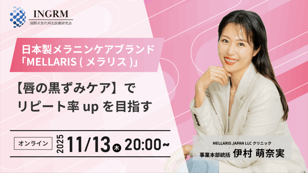 本セミナーでは、色素ケアに特化したメラニンケアブランド「MELLARIS(メラリス)」の概要から症例、施術方法、売上イメージまでご紹介いたします。「既存メニューの単価が上がらない」「他店との差別化が難しい」などのお悩みを抱えるサロン・クリニック関係者の皆様に向けて、新たな選択肢として唇の黒ずみ・くすみ・色素沈着にアプローチする新しい市場「リップメラニンケア」への参入がイメージができる内容です。